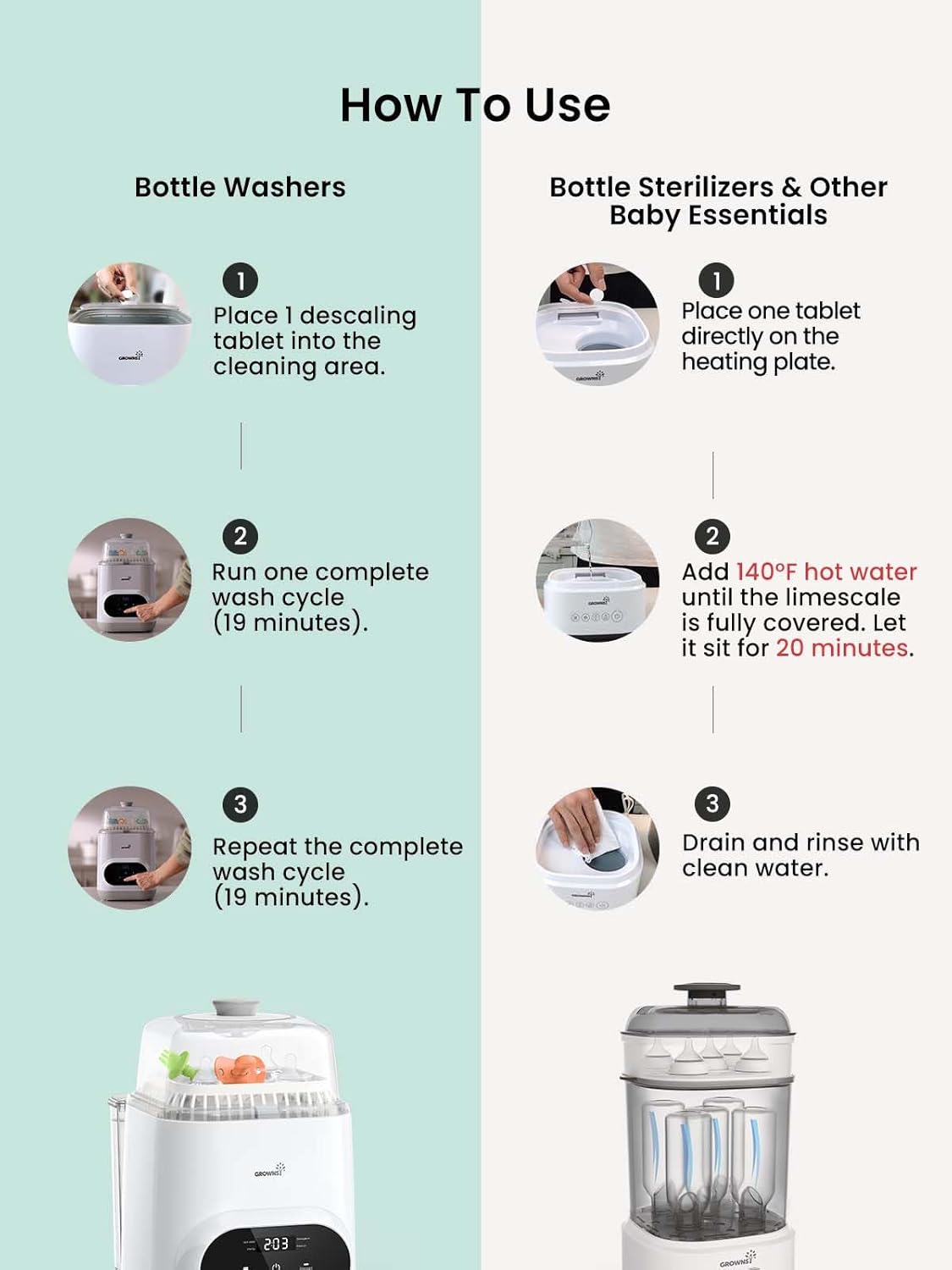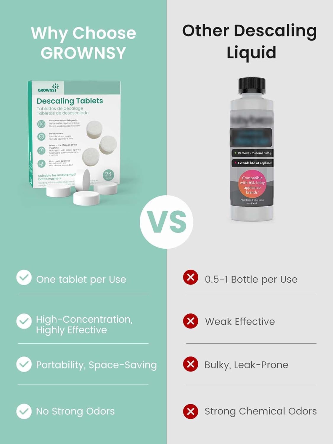 - ๐๐ง๐ข๐ฏ๐๐ซ๐ฌ๐๐ฅ ๐๐จ๐ฆ๐ฉ๐๐ญ๐ข๐๐ข๐ฅ๐ข๐ญ๐ฒ: GROWNSY descaling tablets compatible with all brands of baby bottle washers. Designed for use in bottle washers, sterilizers, warmers, formula makers, and other baby-feeding machines. One descaling solution for all your essential baby appliances.