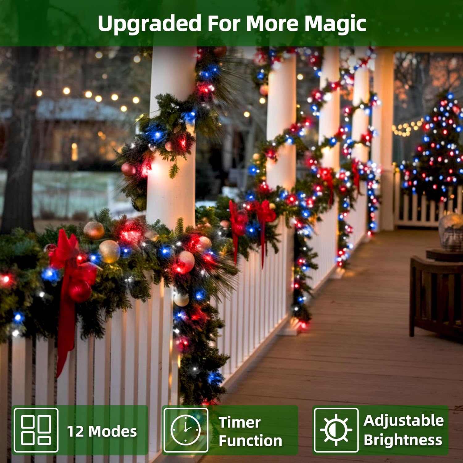 - Perfect Size for Everyday Decorating: At 75ft with 300 LEDs in red cool white and blue, these Christmas string lights blend crisp sparkle with dreamy calm. Just right for balconies, porches, stair railings, mantels, or a 7–9ft Christmas tree. The perfect size for stylish, cozy decorating. Connect up to 3 sets (225ft, 900 LEDs total) to drape fences, patios, or the front of your home in an enchanting winter glow.