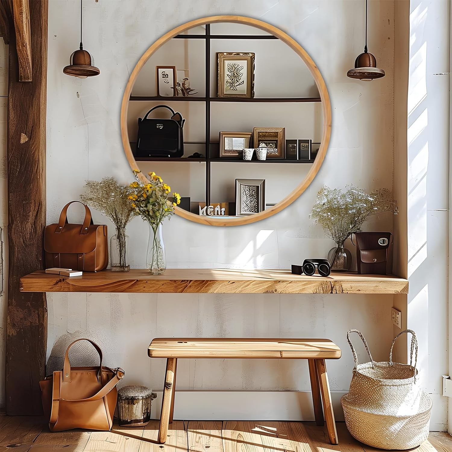 - 【Well Made】The circle mirror is well-constructed, the high-quality glass mirror fixed and embedded in a sturdy wooden frame to prevent bending and warping, ensuring the durability of the bathroom vanity mirror. The polished wood backing adds stability to the hanging mirror and also prevents damage to the wall.