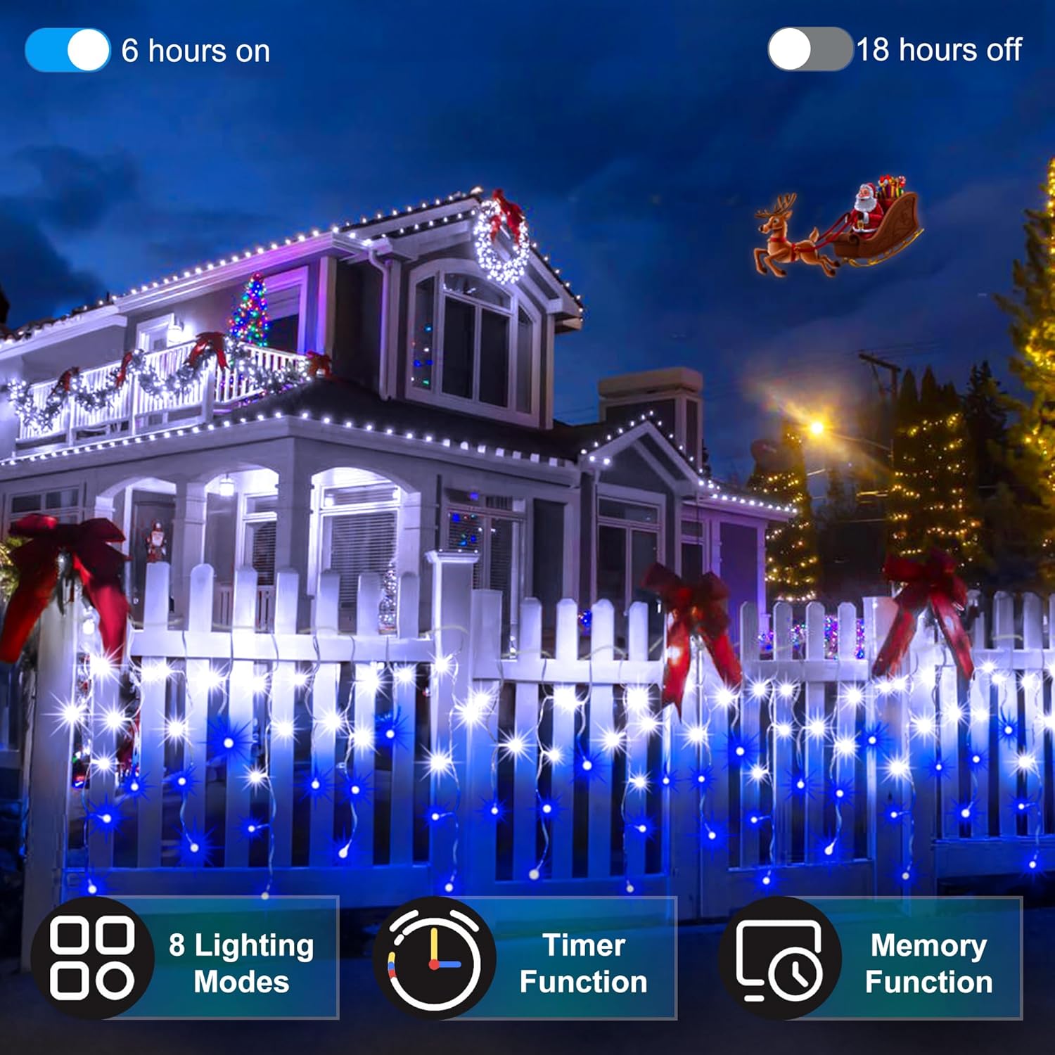 - Dual-Tone Cool White & Blue Icicle Lights: Create a captivating winter wonderland with this 132ft LED icicle string lights featuring cool white and blue LEDs. With 1332 energy-efficient bulbs and 296 drops, these lights produce a stunning frosty aqua glow that mimics glacial elegance. Perfect for outlining rooflines, windows, fences, and trees, this dual-color combination creates a magical frozen effect ideal for both residential and commercial holiday decorating