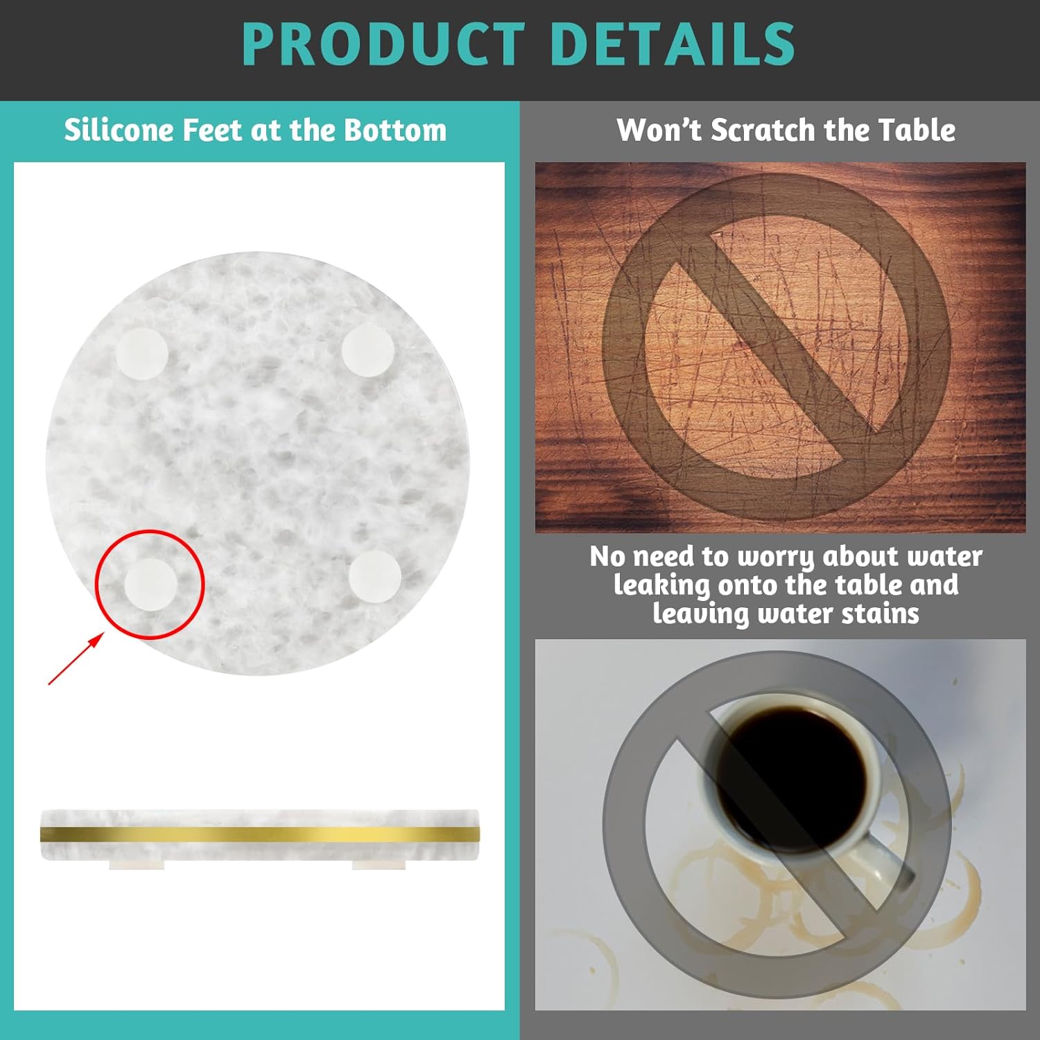- [ Ultimate Table Protection ] : Equipped with 4 silicone feet, these coasters protect your table surfaces from scratches and prevent heat damage. Their original heat-resistant properties, combined with the silicone feet, keep your tables safe from hot beverages and unsightly marks.