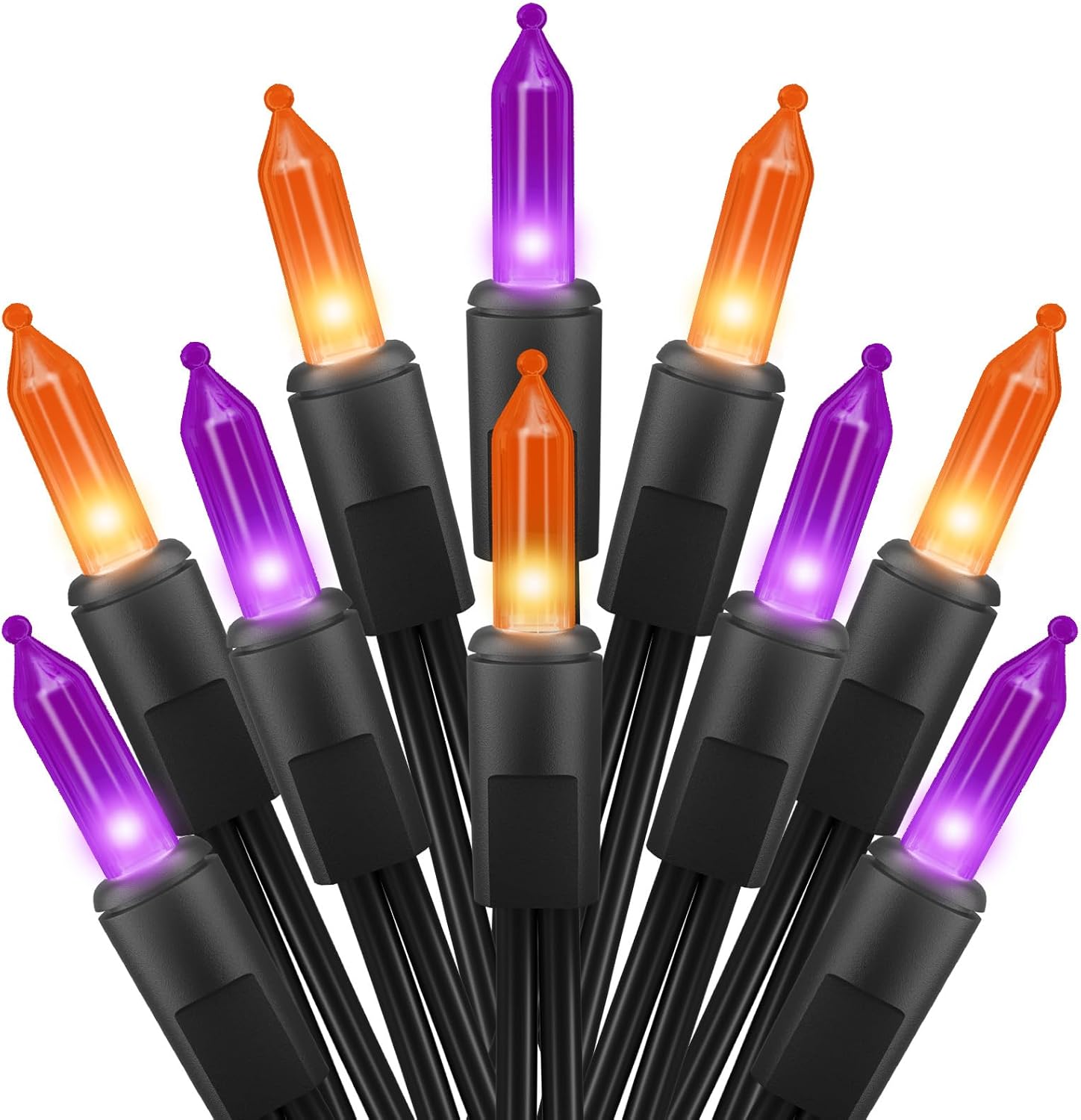- Clear Halloween Lights: 2 Pack Incandescent Halloween Orange & Purple Lights, 13 feet orange & purple lights set with shimmering 50 count clear orange & purple mini bulbs, 3 inches amazing spacing for reasonable winding around the other haunted stuff like pumpkin, ghost, witch, and more, 18 inches lead cord for stretching out from indoor to outdoor, an ideal Halloween essential decoration