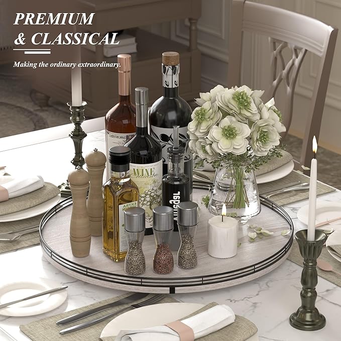 - PERFECT GIFTS: This wooden tray can not only be served as a lazy Susan to organize, but also be served as a decorative tray to decor your coffee table, dining table, kitchen, home with its charmed rustic farmhouse style. Perfect for a wedding, Birthday, housewarming gift, Mother's Day gift, or centerpiece for any occasions. Tastefully packaged, our turntable organization makes a thoughtful and practical gift for someone who loves home organization and home decoration. No assembly was required.