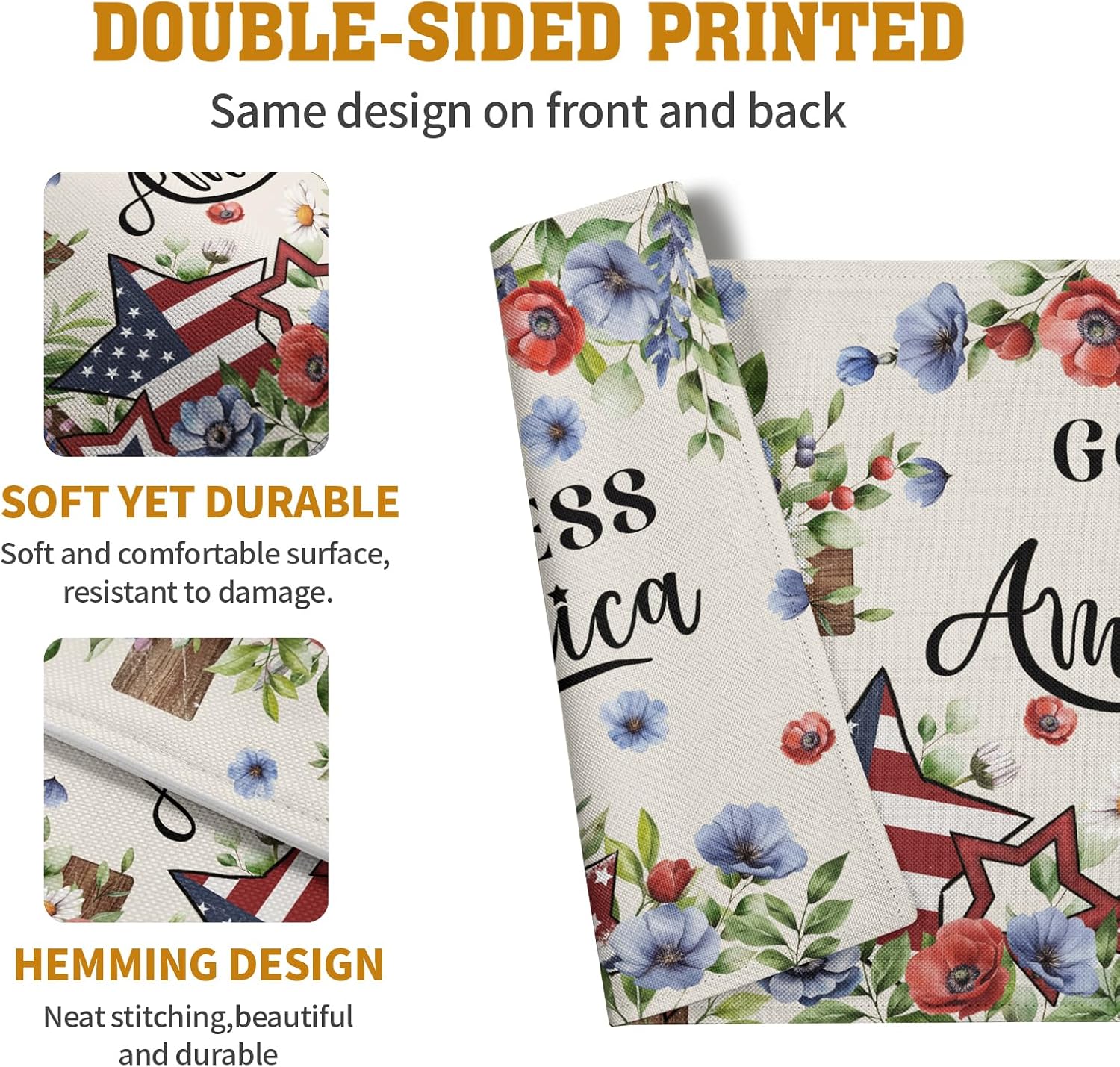 - EASY TO CARE: 4th of July placemats are machine washable, laid flat to dry. Do not bleach. Keep as good as new after washing. Combined with practicality and aesthetics, it is easy to fold and occupies a small area. No wrinkles, no shrinkage