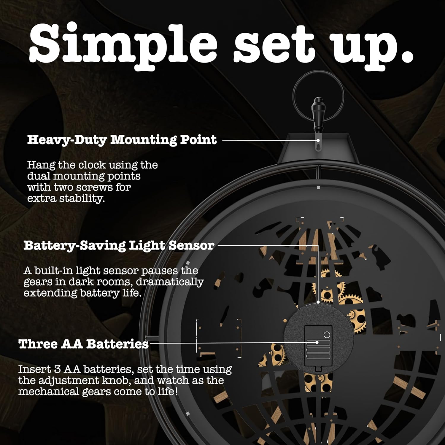 - SIMPLE SET-UP & BATTERY SAVING LIGHT SENSOR: Insert 3 AA batteries (not included) and set the time with the knob on the back. Hang the clock with the included hardware. A built-in light sensor pauses the gears in dark rooms, dramatically extending battery life.