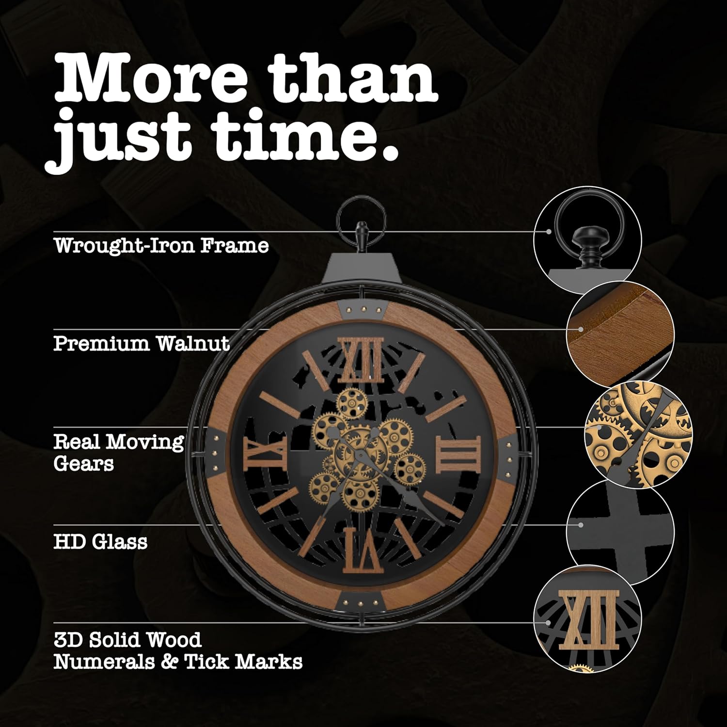 - TIMELESS STYLE: Stay on schedule with your new Driini Large Rustic Wall Clock. This oversized, 18 inch moving gear wall clock features a premium wooden frame, and a decorative black wrought-iron skeleton. The clock face is protected by a HD tempered glass for clear visibility and durability. A big, looped handle on top adds to its aesthetic as an industrial steampunk clock or gothic clock, while also invoking nautical and farmhouse vibes. Hand-cut 3D solid wood Roman numerals and tick marks are individually mounted to ensure visibility from any angle.