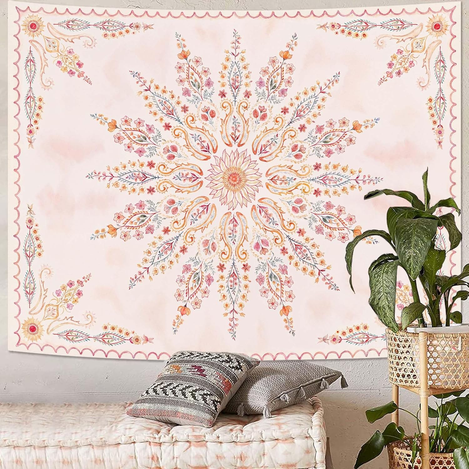 Fowocu Boho Floral Mandala Tapestry for Bedroom Aesthetic Pink Bohemian Flower Wall Tapestry Watercolor Hippie Indian Tapestries Wall Hanging for Living Room Dorm Decor 60 x 44 Inch