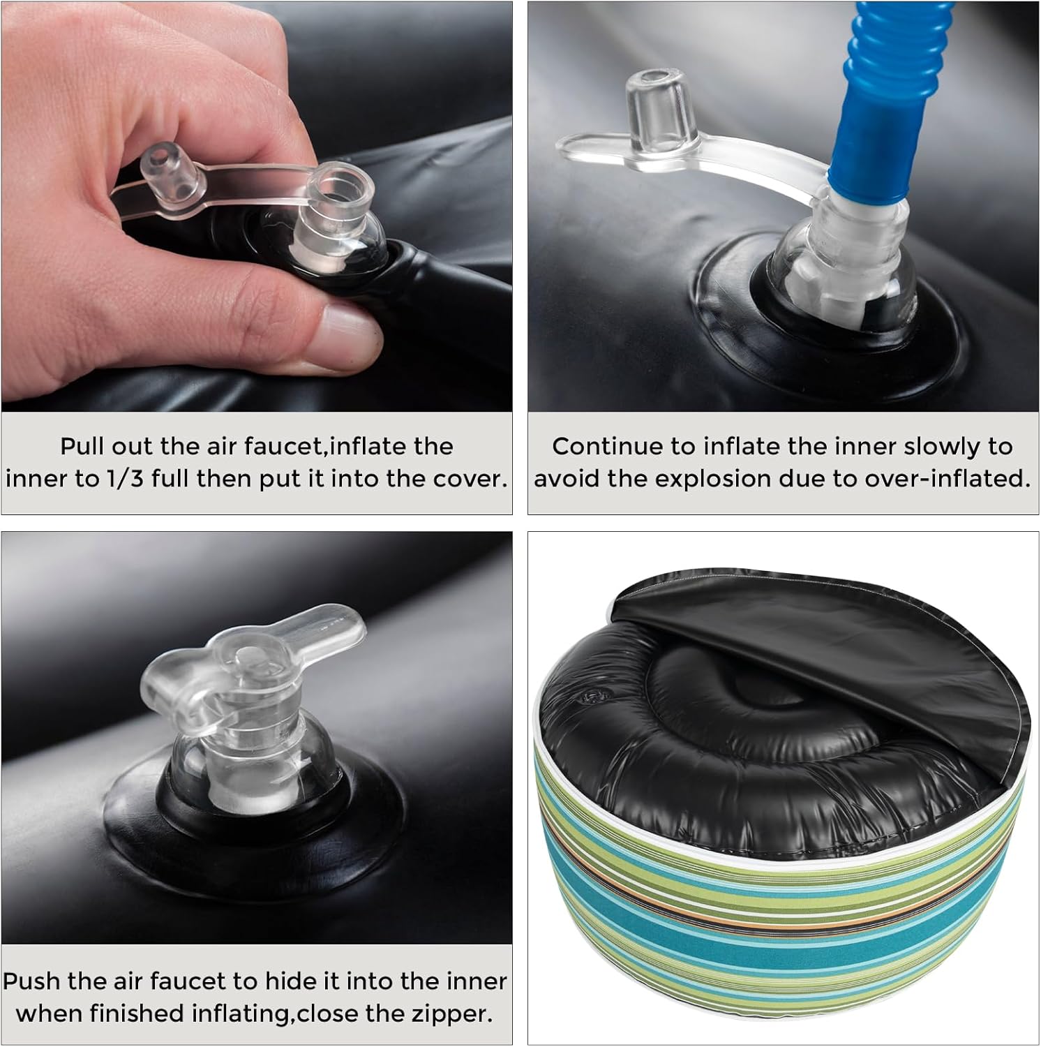 - 【Durable Outdoor Material】-Inflatable ottoman cover made from durable, waterproof material that can withstand exposure to all weather. Fade-Resistant keep its original color and pattern even if exposed to the direct sunlight for over 500 hours. The black inner made of waterproof thick PVC fabric that can bear up 300 lbs.Very easy to clean and maintain.