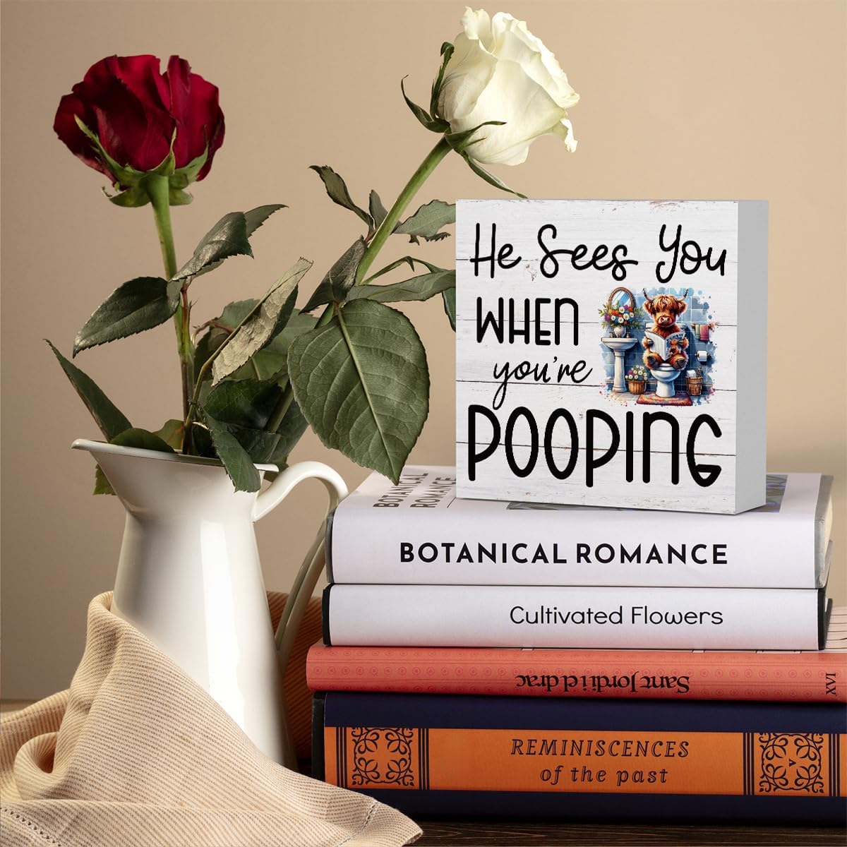 Funny Highland Cow Decor Memorial Day Fourth of July Independence Day Decorations Red White and Blue Decor, Rustic Farmhouse Home Office Wooden Box Sign for Bathroom - He Sees You When You're Pooping