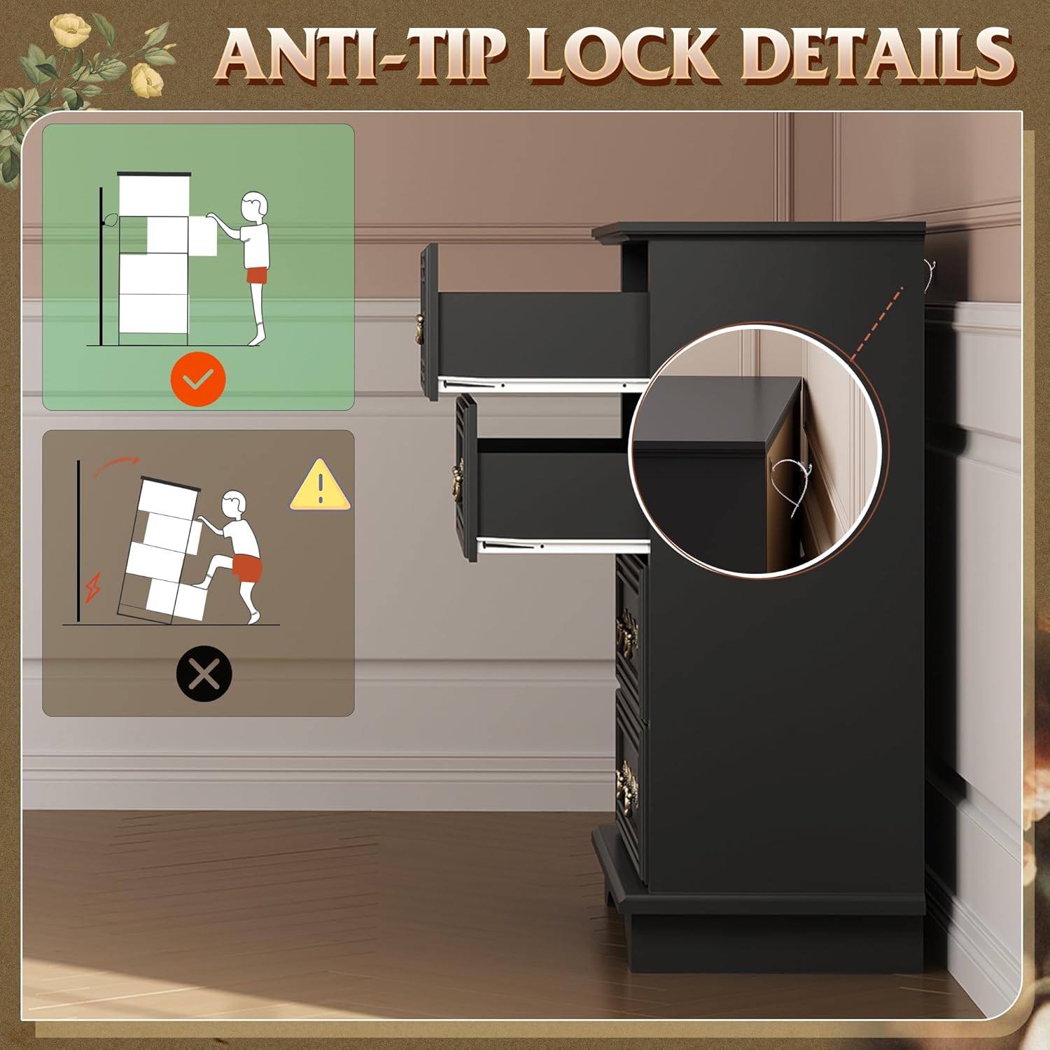 - 🏡【Safe and Sturdy】The dressers & chests of drawers are made of durable engineered wood, featuring a thick tabletop that can support heavy items. Sloping edges and widened legs improve stability. An anti-tipping device ensures child safety by preventing wobbling and tipping.