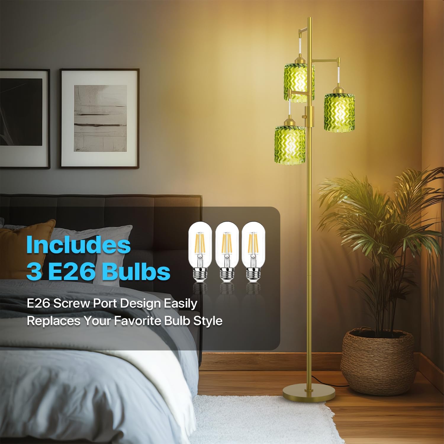 Gold Floor Lamp for Living Room, Vintage 3-Light Green Glass Standing Lamp, Brass Base Mid Century Modern, Retro Tree Design Tall Floor Lamps
