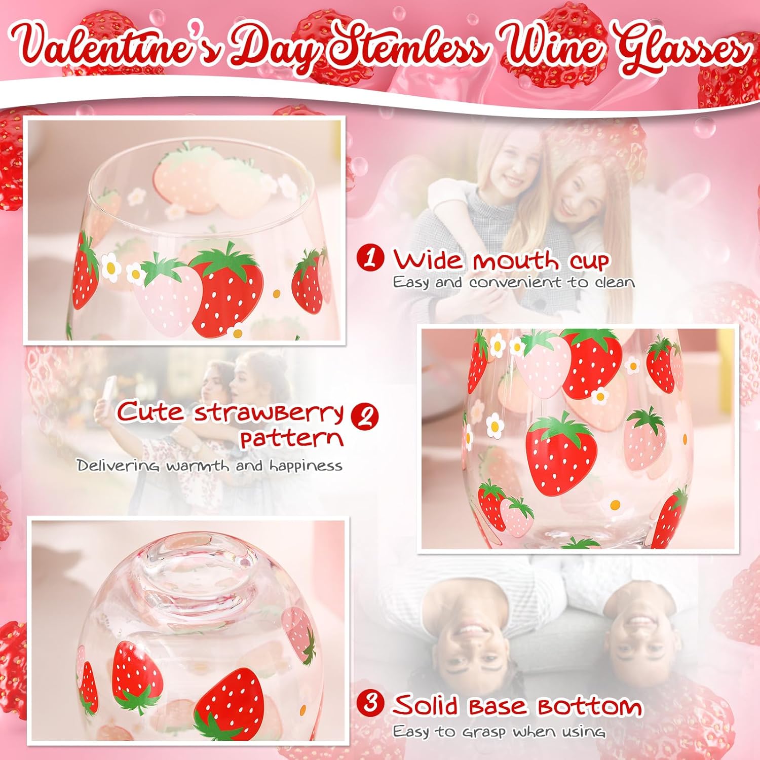 - Strawberry Theme: this strawberry glass cup feature colorful conversation strawberry patterns, ideally fitting the strawberry theme; They are ideal for serving you and your loved ones on a romantic evening; Made of lead-free glass, safe, healthy, and durable; Please note that they should only be hand washed