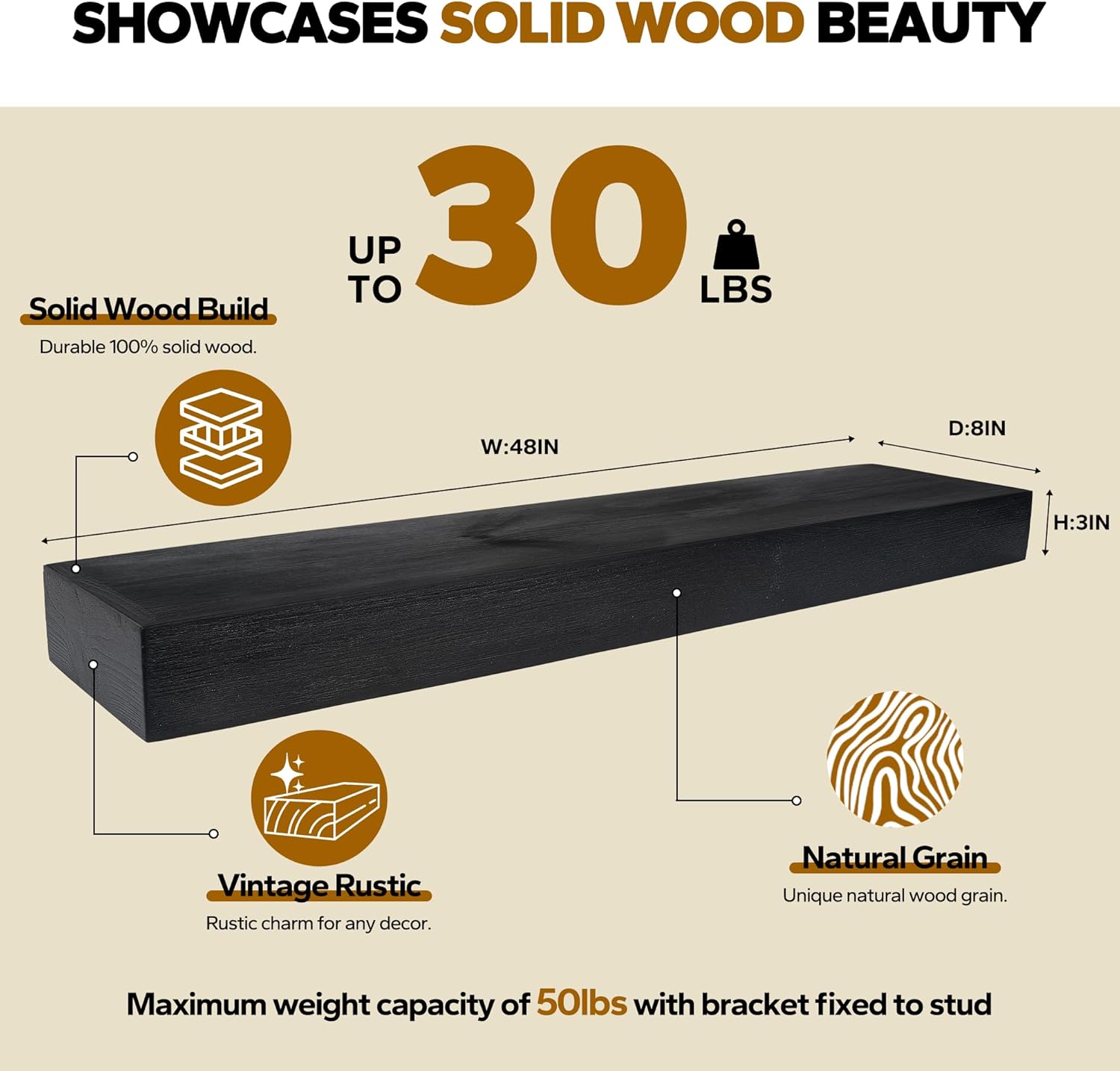Floating Shelves 3 inch Thick for Wall Set of 2,Solid Pine Wood Wall Mount Shelf for Kitchen Living Room Bedroom Bathroom,8" D x 48" L x 3" H-Black