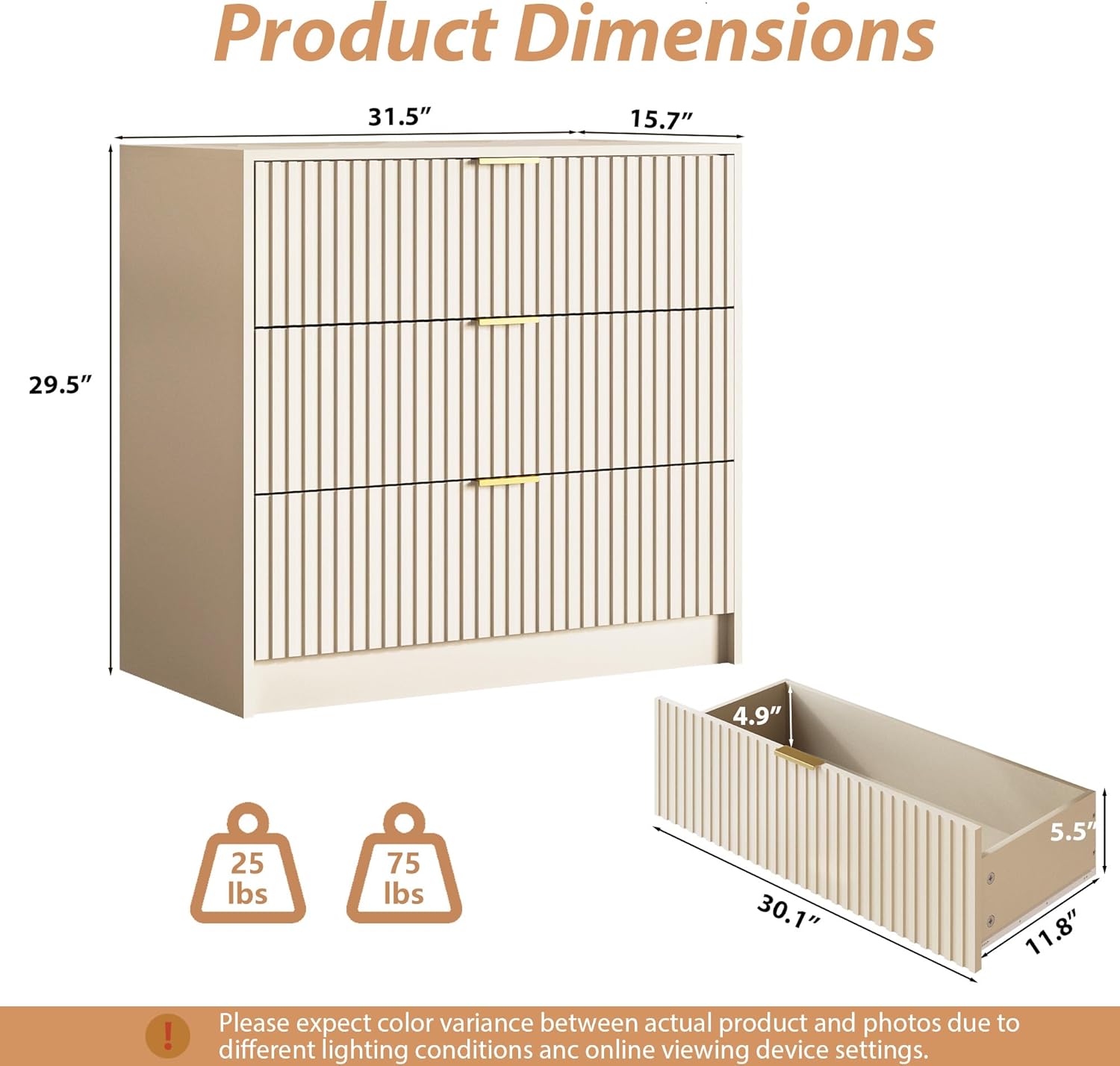 Fluted Dresser for Bedroom, 32 Inch Wide Nightstand with Large Drawer, 3 Drawer End Table for Bedroom, Living Rooms, Offices, and Entryways, Beige