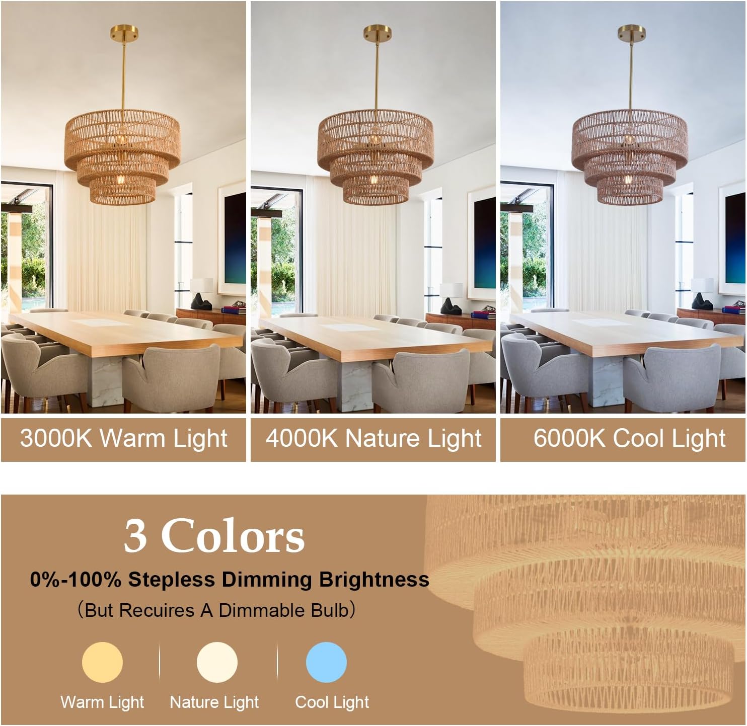 - Versatile & Safe Bulb Compatibility - Rattan farmhouse chandelier features 6* E26 sockets, accommodating bulbs like incandescent, halogen, and LED (60W Max, Not Included). Dimmable with compatible bulbs and switches.It could be dimmable if you install compatible dimmable bulbs and switch then you could install with warm white 3000k, neutral white 4000k or cool white 6000k bulbs as you like