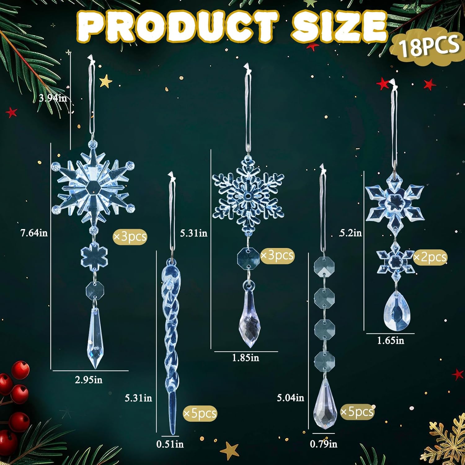 - Package: You will receive a great value pack of 18 pieces blue acrylic Christmas ornaments set in 5 styles, including 8pcs unique designed snowflakes ornaments (5.2", 5.3" and 7.64"), 5pcs 5.3" crystal icicles ornaments and 5pcs 5" bead garlands.