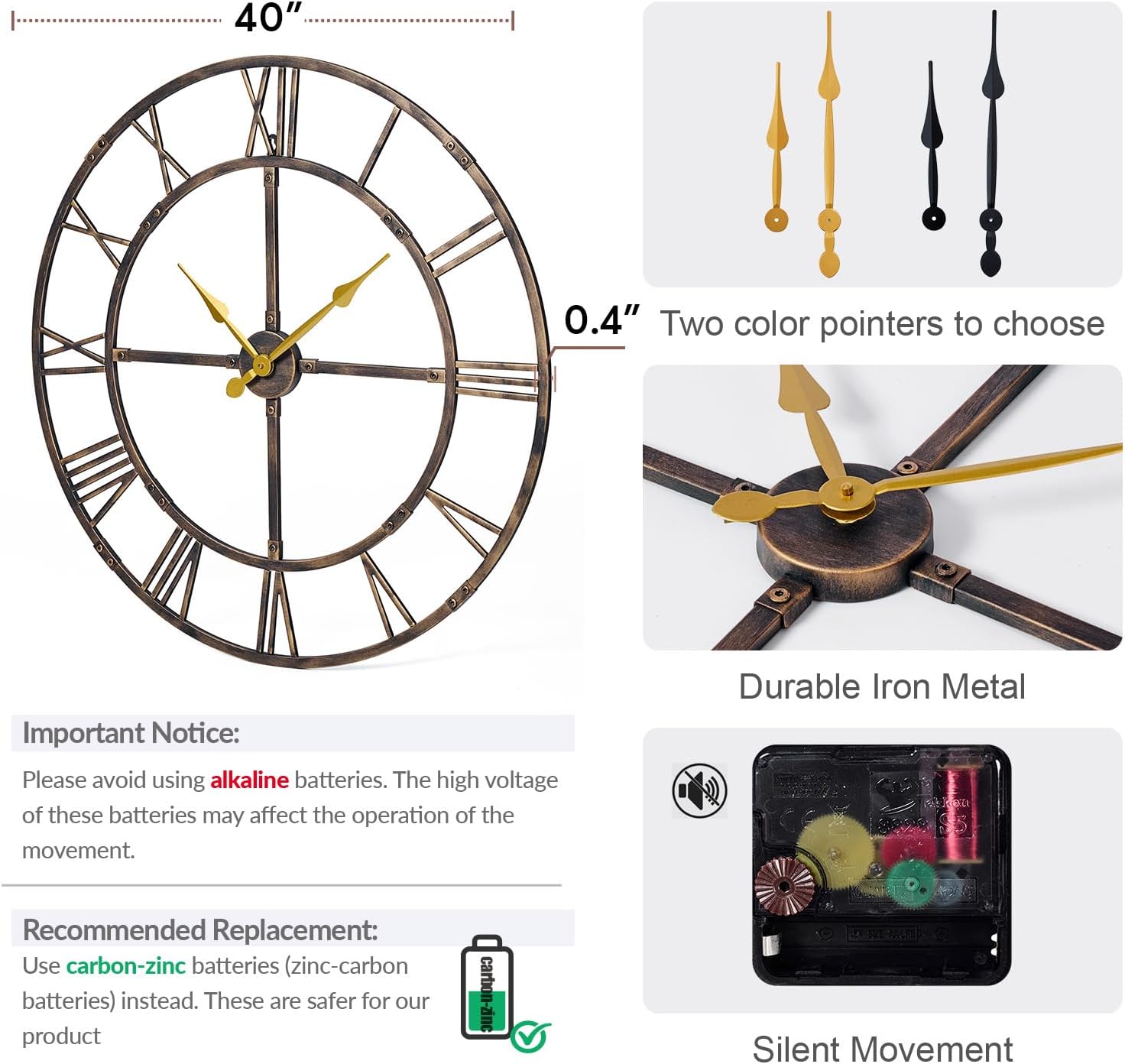 Large Wall Clock for Living Room Decor – 40 Inch Silent Non-Ticking Modern Farmhouse Wall Clock, Oversized Decorative Metal Roman Numeral Clock, Bronze