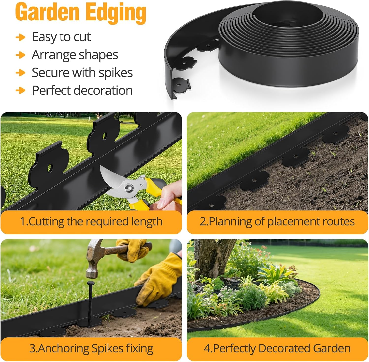 - Easy to Install: Place the lawn edging strips along the planned lines, push the anchoring spikes through the edging strip holes, and tap them into place with a rubber mallet