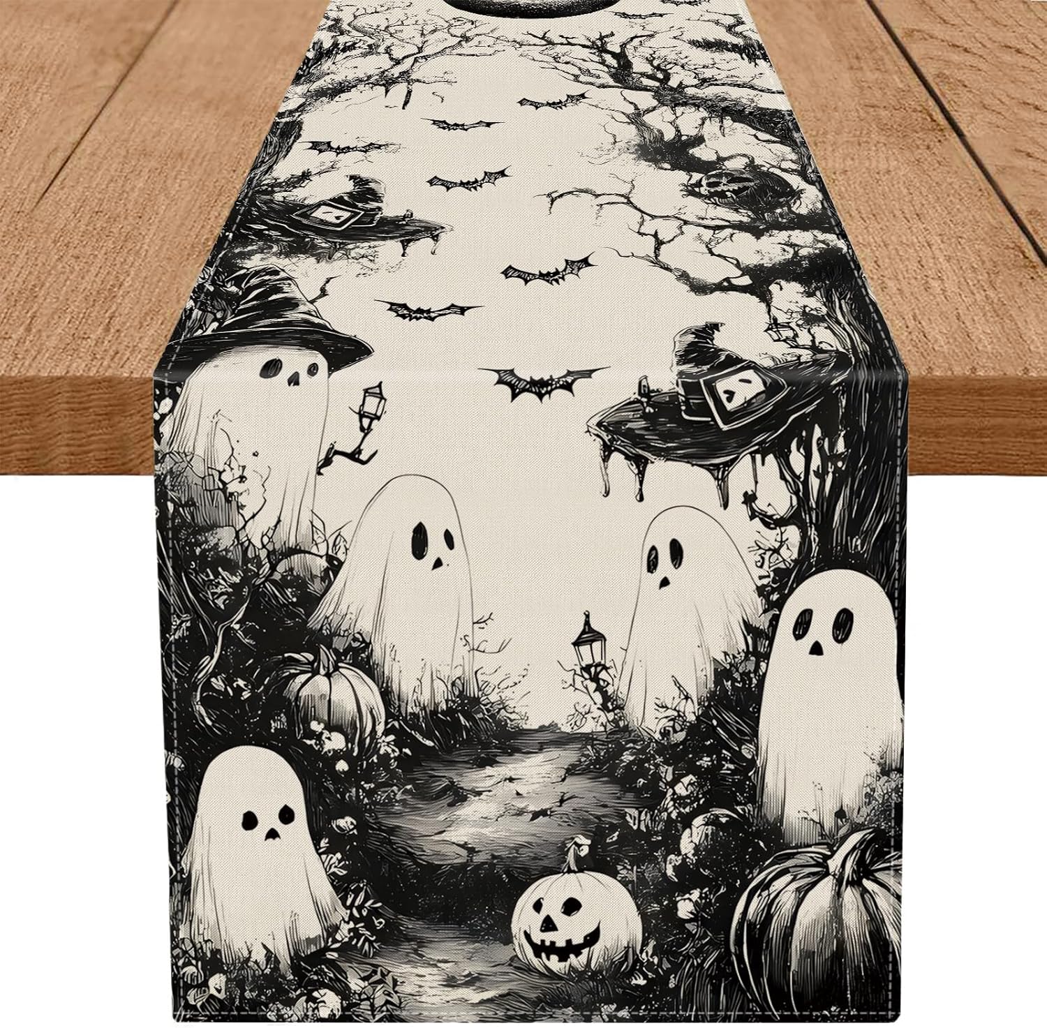 GPGHE Halloween Table Runner Black Ghost Holiday Burlap Table Decoration Indoor Outdoor Home Decor Party Supply 13 x 72 Inch