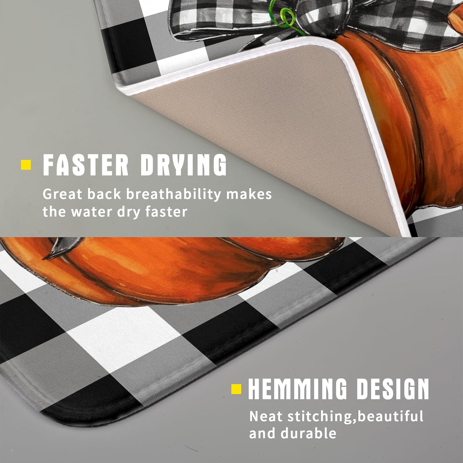 - 【Absorbent】The fall pumpkin dish drying mat is a 3-ply design made of absorbent microfiber, composite sponge, and cotton sateen fabric, the dish drying pad absorbs 4X its weight in water. Perfect for air-drying dishes, glasses, pots, pans, bottles, fruits, and vegetables.