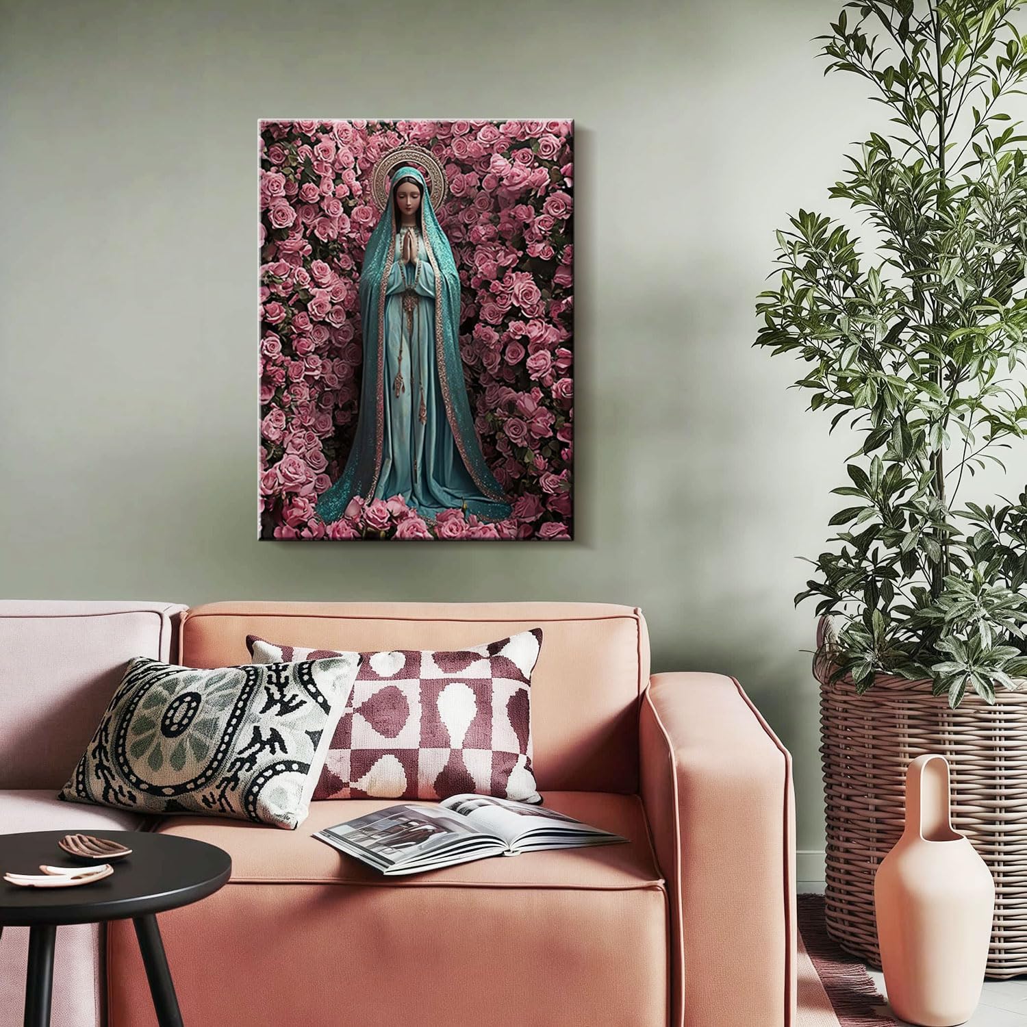 - Elegant and Spiritual Design – Features the Virgin Mary in a turquoise robe surrounded by vivid pink roses, symbolizing peace, grace, and divine beauty, ideal for any Christian or Catholic home.