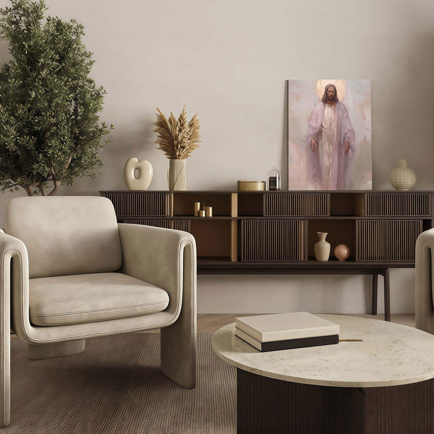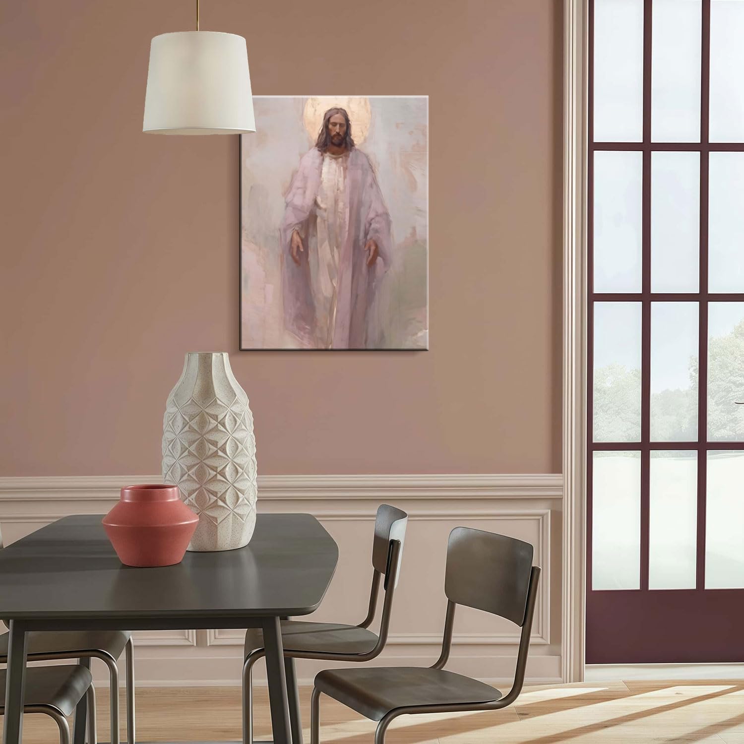 - Spiritual and Calming Image – A gentle depiction of Jesus in soft lavender robes with a glowing halo, bringing a sense of peace and inspiration to any room.