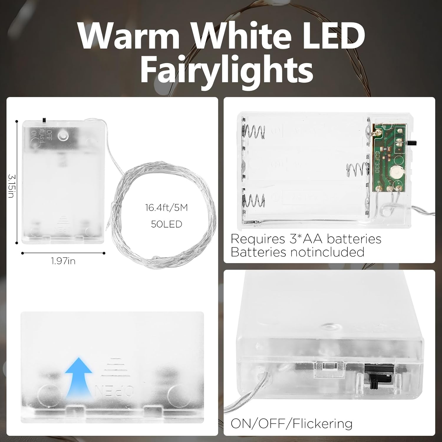 - 2 Pack of Fairy Lights: Fairy Lights Powered by 3 AA batteries (not included), each string of Fairy Lights has 16.4ft 50 energy-efficient Leds. The upgraded design has significantly extended the working hours of Fairy Lights.