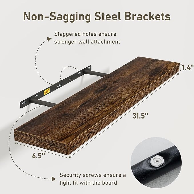 - Easy To Assemble: This floating shelves not only come with stainless-steel galvanized invisible brackets, but also equipped a fixing screw at the bottom to fix the shelf on the support rod, which solves the problem of sliding and is not easy to damage, and can be used for a long time. Instructions, magnetic level, drywall anchors, and screws included. This is great because you can easily mount these rustic shelves Gap-Free to any surface in less than 10 minutes