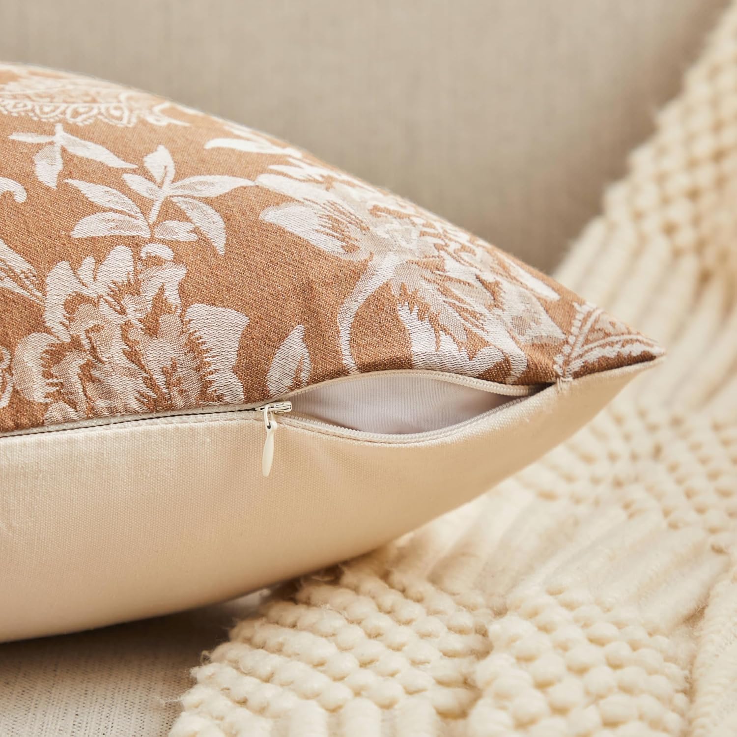 Floral Jacquard Throw Pillow Covers Set of 2, Background/Caramal 24x24 Inch, Farmhouse Decorative Cotton Caramal Cushion Covers for Sofa Bed Living Room Home Decor