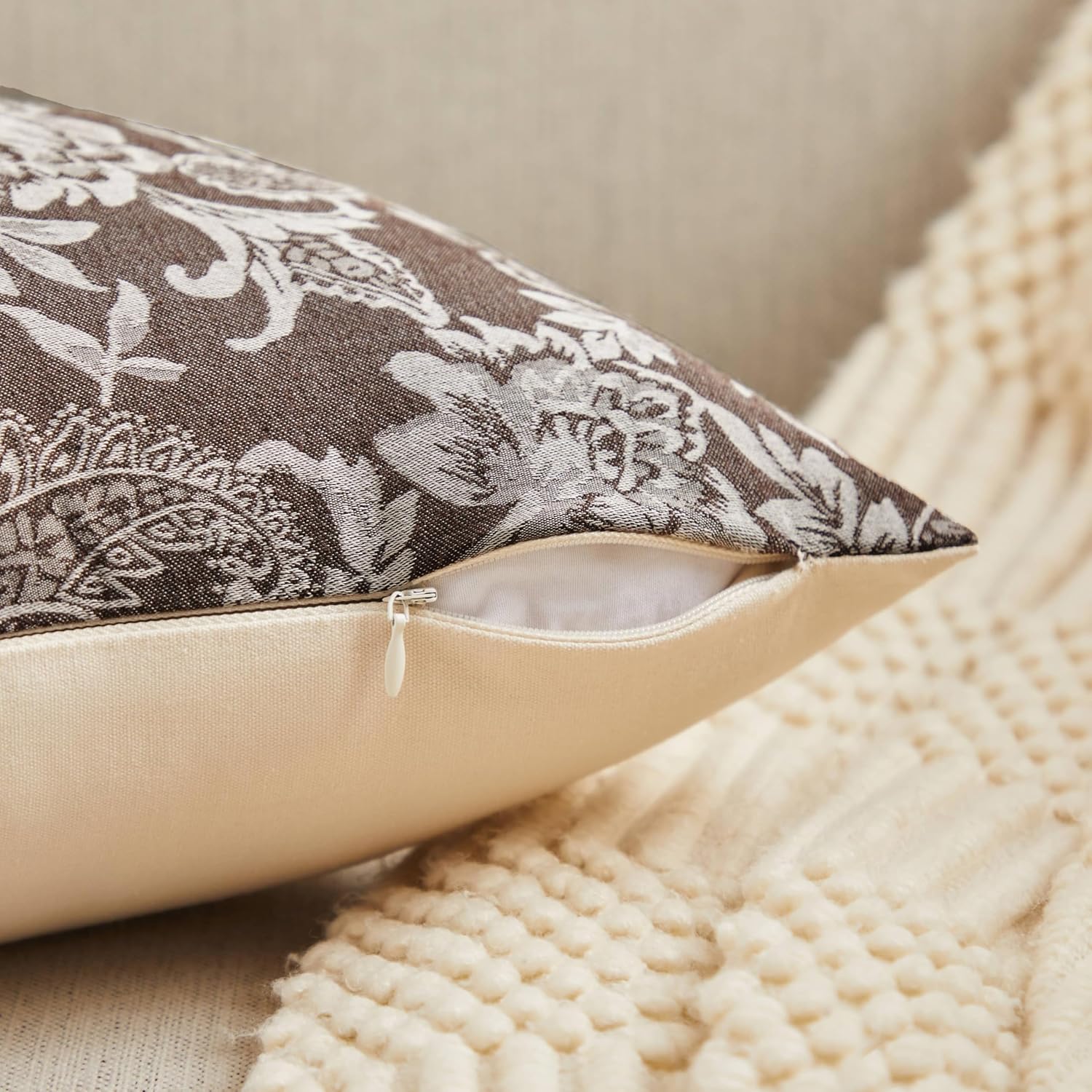 Floral Jacquard Throw Pillow Covers Set of 2, Background/Chocolate 22x22 Inch, Farmhouse Decorative Cotton Dark Brown Cushion Covers for Sofa Bed Living Room Home Decor
