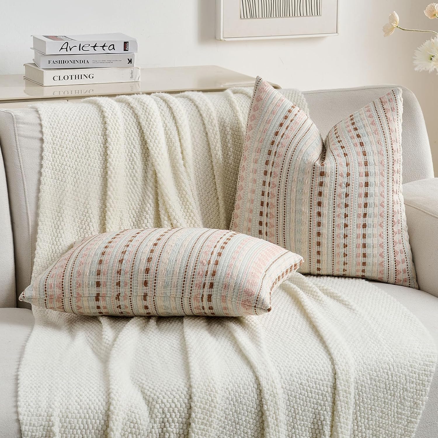 FUTEI Pink Blue Decorative Throw Pillow Covers 12x20 Inch Set of 2,Soft Cozy Chenille Jacquard Textured Pillow Case,Boho Home Decor for Couch Bed Living Room