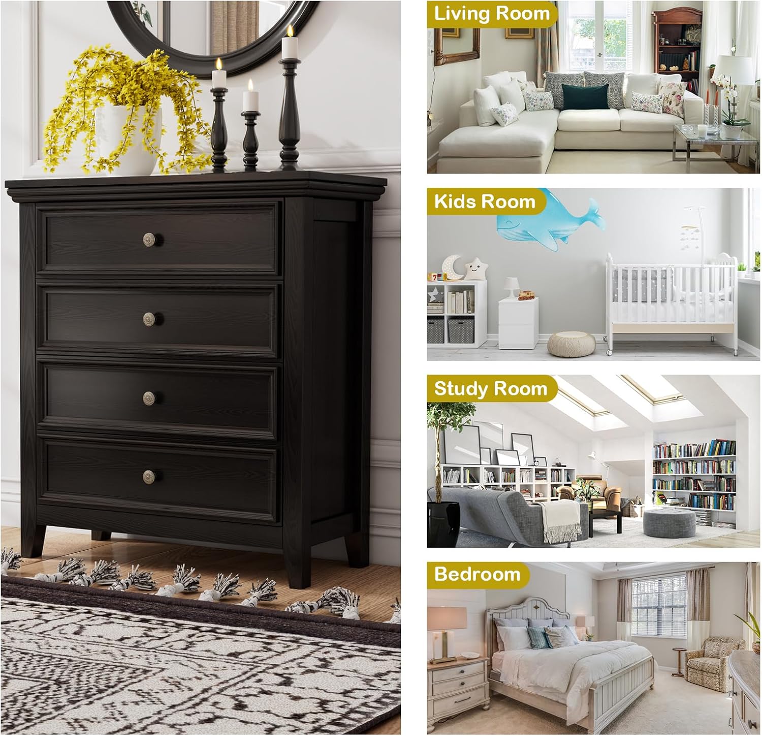 - ćMultipurpose Usageć The modern 4 drawer dresser can sit in any corner of you home to show your taste while bringing great function - in bedroom or closet to put clothes and overflow, in entryway to store keys and daily items.It is ideal for small spaces such as apartments and dorm rooms.