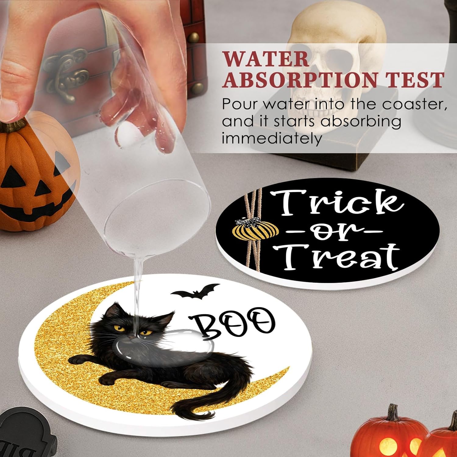 Coaster for Drinks Set of 6, Halloween Boo Black Cat Trick or Treat Spooky Pumpkin Bat Absorbent Round Ceramic Stone Mat, with Cork Base and Metal Holder, Gift for Housewarming Room Bar Decor