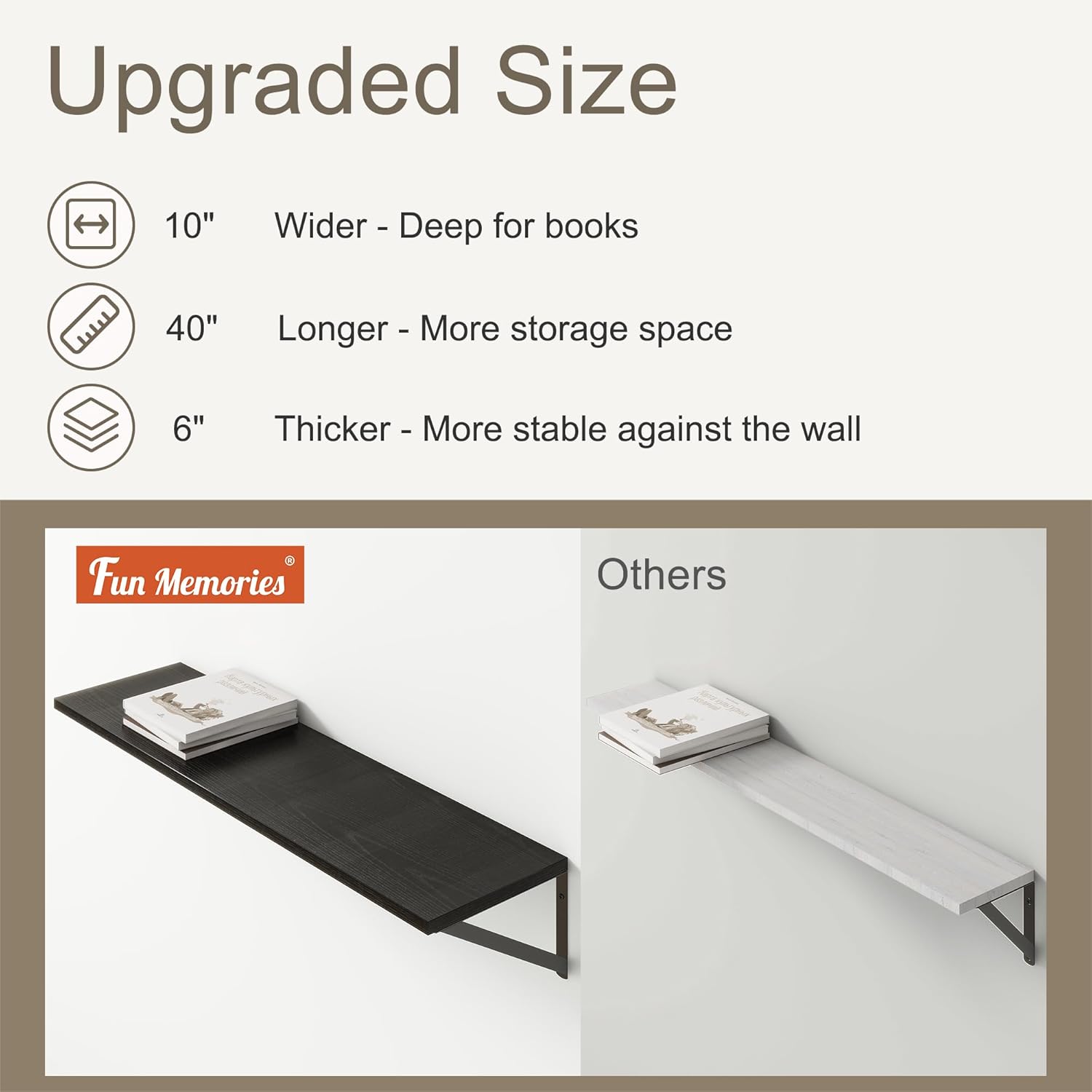 - ă10 INCH DEEP FLOATING SHELFăThis extra deeper and wider wall shelves are 10 inches in depth and 39.4 inches in length instead of the regular narrow floating shelves, you can put photos, pictures, DVD players, videos, books, toys, and some other knickknack on this beautiful display wooden shelf.