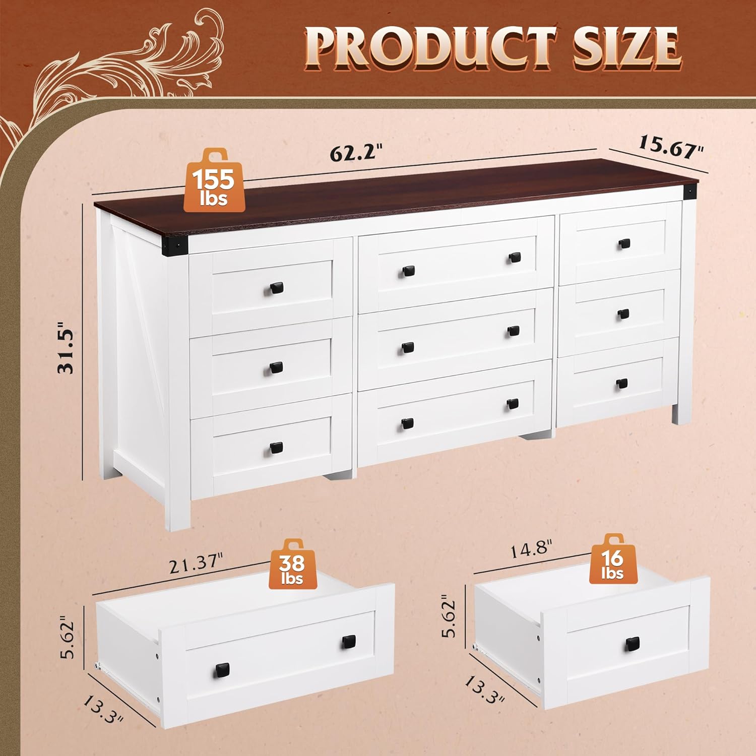 - 🎄【Spacious Storage Space:】15.67"D x 62.20"W x 31.50"H. This chest of drawers comes with six 13.31-inch depth, 14.8-inch width drawers, three 13.31-inch depth, 21.37-inch width drawers, providing as much storage space as possible for different items, effectively keeping your room neat and organized. The wood top is perfect for placing a TV up to 70" TV and frequently used items.