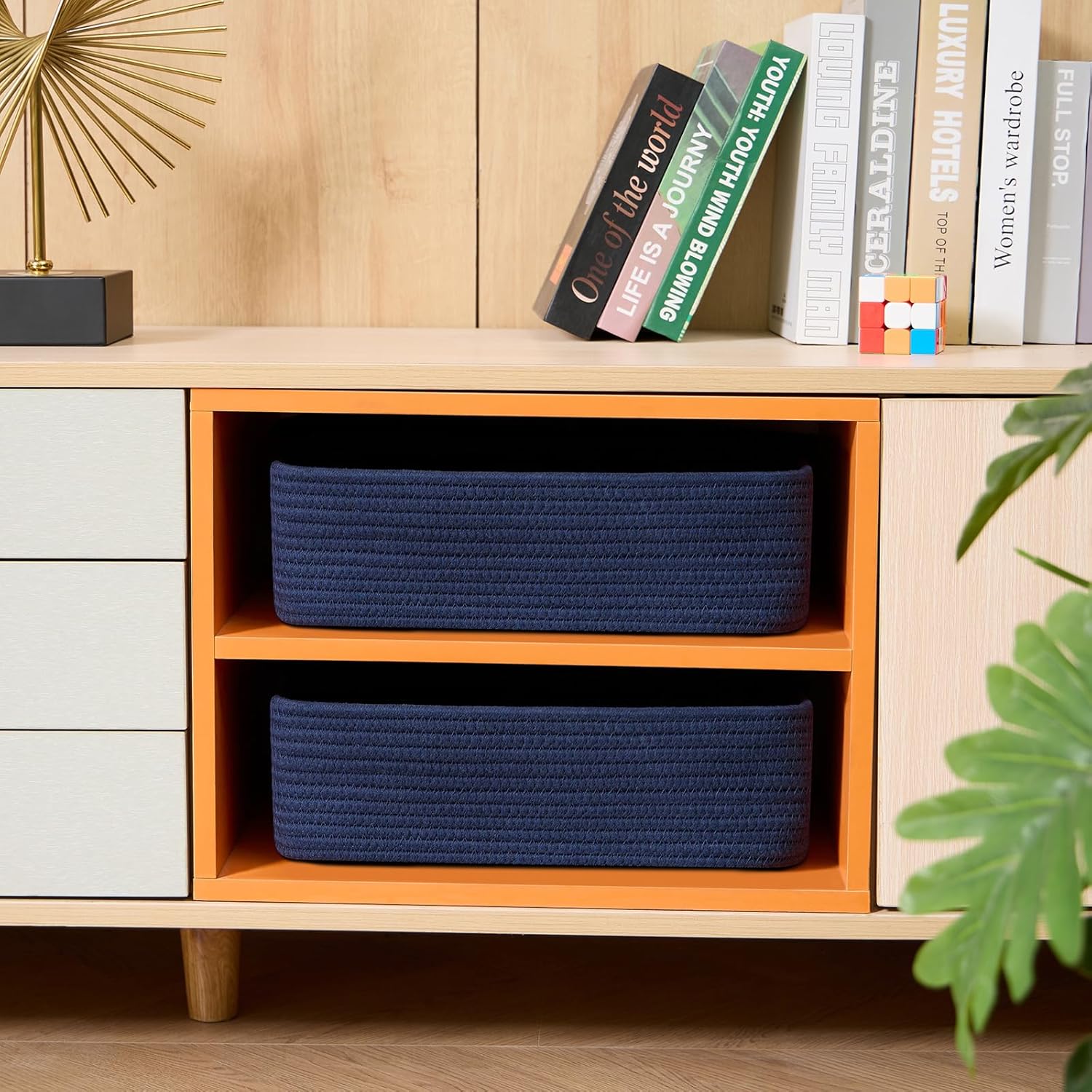 Large Shallow Organizing Baskets 15x11x5.1 Inches - Rope Woven Storage Bins for Bathroom, Shelves, Cube Closet, Navy Blue 2 Packs