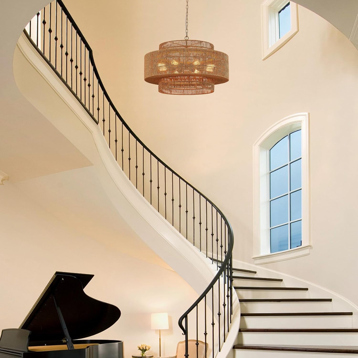 30” Large Rattan Chandelier Light Fixture 8-Light Vintage Farmhouse Hand-Woven Boho Bamboo Rattan Chandelier 3-Tier Drum Wicker Gold Chandeliers for Dining Room, Kitchen, Living Room