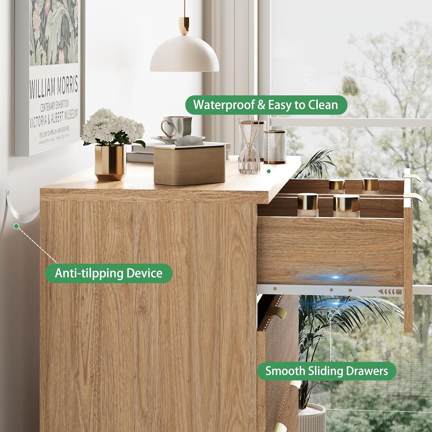 - 【Stability & Safety】The white/black/natural oak/grey dresser is equipped with an anti-tipping device, which can be fixed on the wall to prevent accidents. Each drawer contains a wide metal handle and built-in slide rail, easy to push and pull. Besides, the sturdy base provides this dresser with drawers a strong support and the middle feet can be adjustable to keep balance on uneven floors