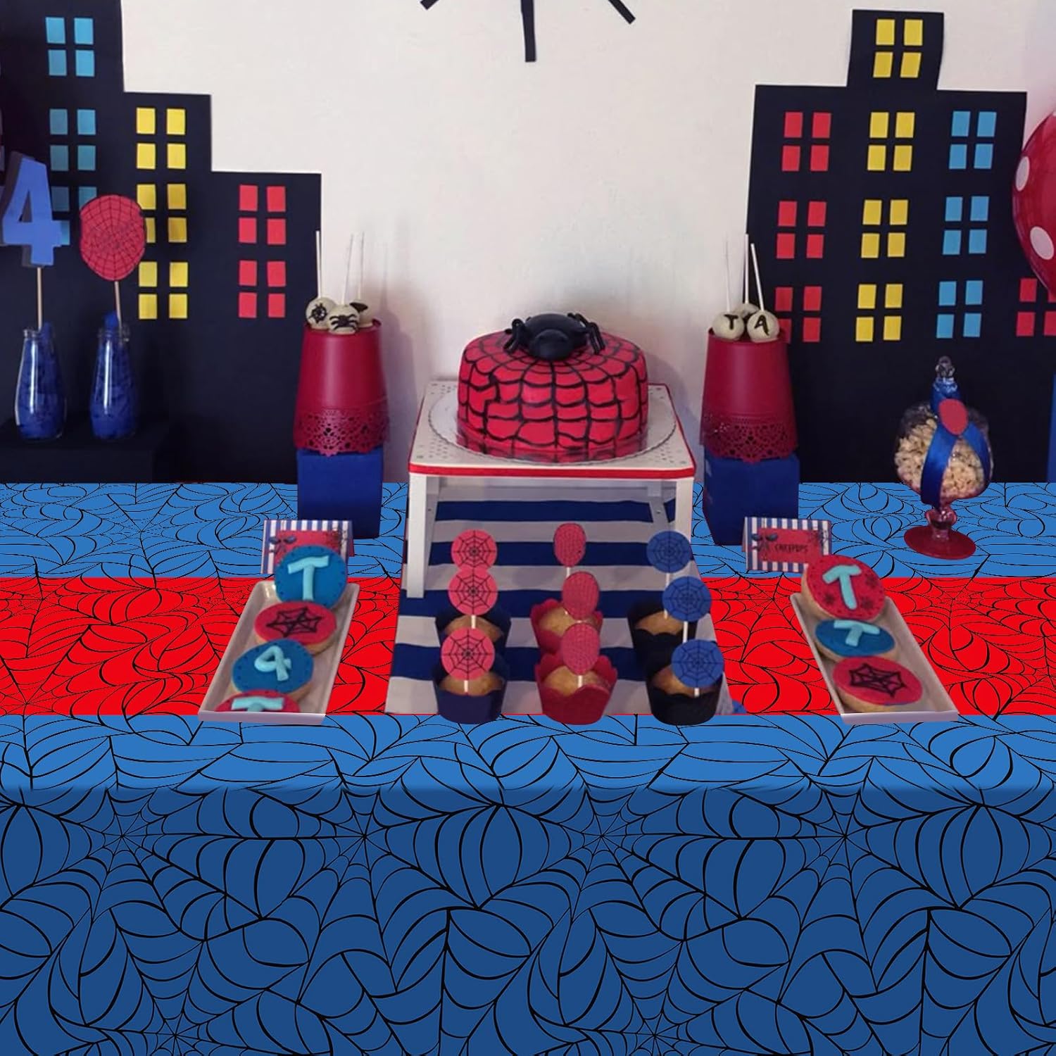 - Cute Design: our spider hero tablecloth design with red runners with black webs in the middle,the both sides are blue colors with spider webs,which will add the taste of theme birthday cheerful decor for kids.