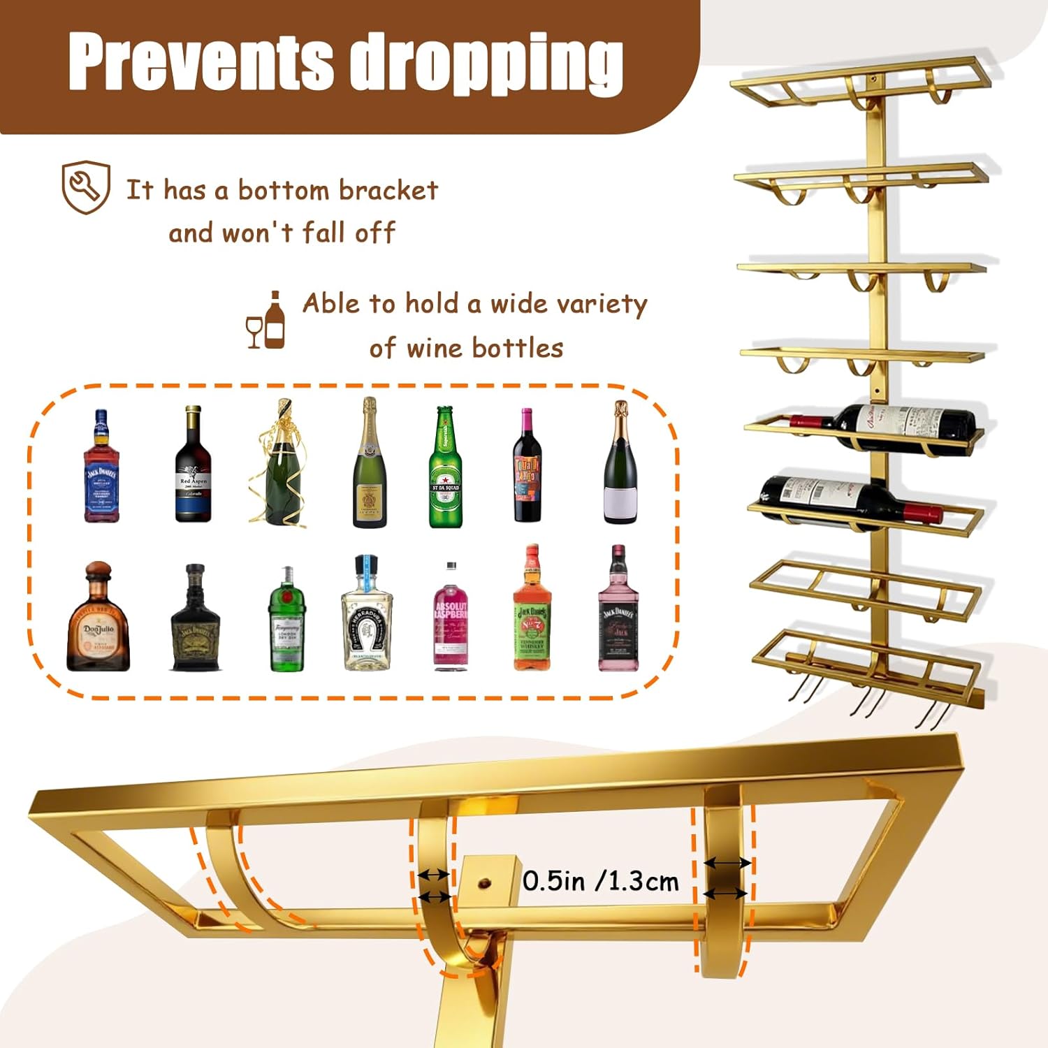 - Prevents Bottles from Falling: The wine glass rack wall mounted comes with a bottom bracket that is 0.5in/1.3cm wide, and each tier of wine shelf is supported by three bottom brackets to ensure that large and small bottles can be placed safely and attractively