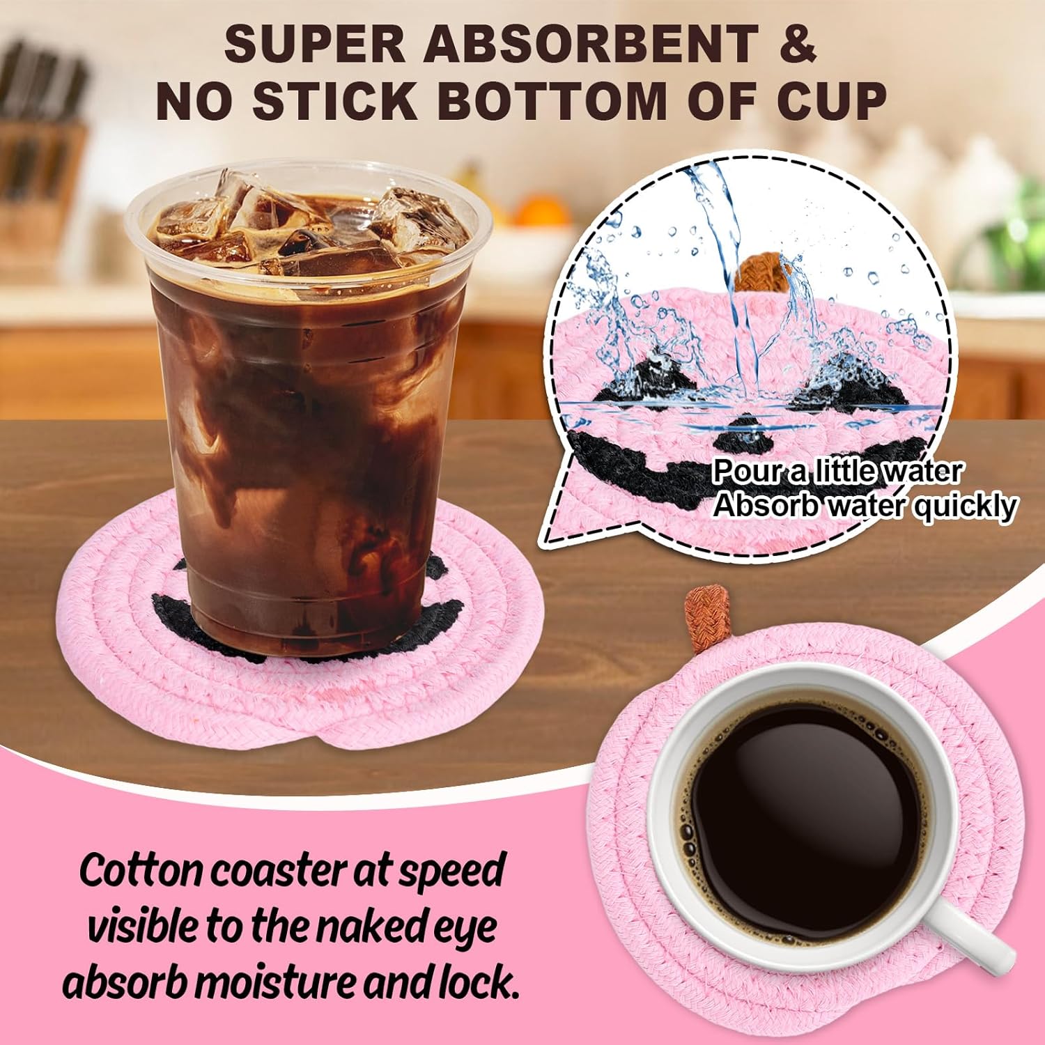 Whaline Halloween Pumpkin Cotton Coasters Pink Pumpkin Face Handmade Braided Drink Coasters Absorbent Cup Mats for Trick or Treat Party Home Table Decor, Set of 4