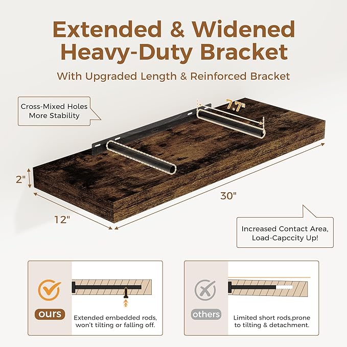 Floating Shelves 30 Inch Long, 12 Inch Deep Floating Shelf for Books, Rustic Wood 30 x 12 Storage Shelves for Wall Storage & Display, Thicked Wall Shelf for Kitchen, Living Room, Rustic Brown, 1 Pack