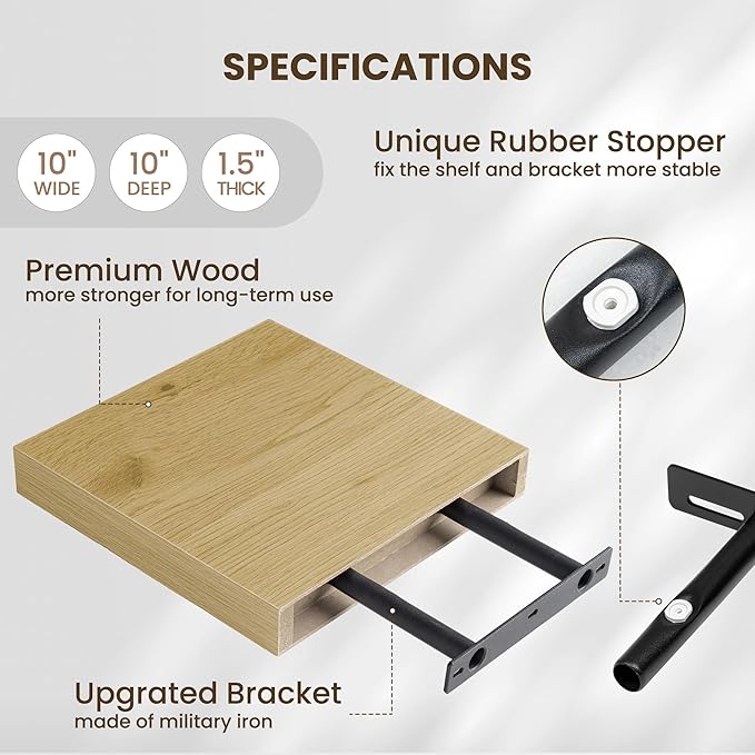 Fun Memories Floating Shelves for Wall - 10" x 10" Wood Shelf with Invisible Bracket - Deep Floating Shelves - 10 Inch Shelf Wall-Mounted for Living Room & Bathroom - Oak - Set of 2