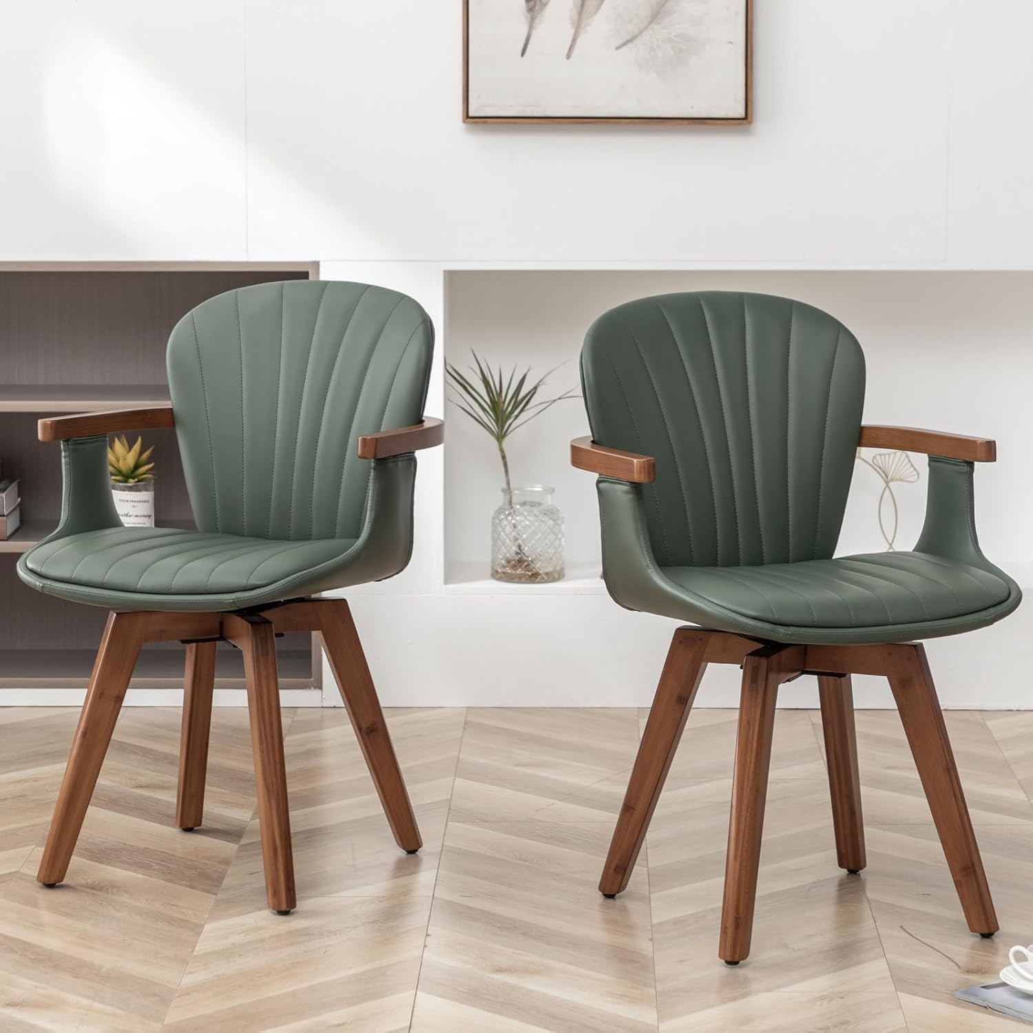 LUNLING Swivel Dining Chairs Set of 4, Mid Century Modern Green Faux Leather Kitchen Chairs with Arms,Bamboo Legs Side Chairs No Wheels,Accent Chair for Dining Rooms and Offices